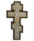 Handcrafted wooden cross with gold-embossed icon of the Crucifixion.